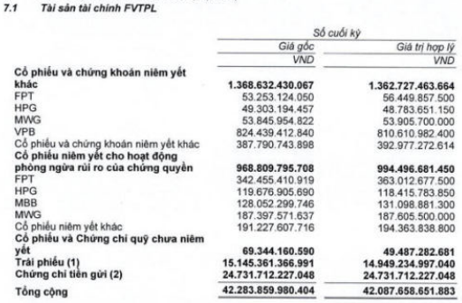 FVTPL đang phân bổ vào cổ phiếu (62%), trái phiếu (10%), ủy thác đầu tư (25%), còn lại là chứng chỉ tiền gửi. Báo cáo không thuyết minh chi tiết danh mục nắm giữ.