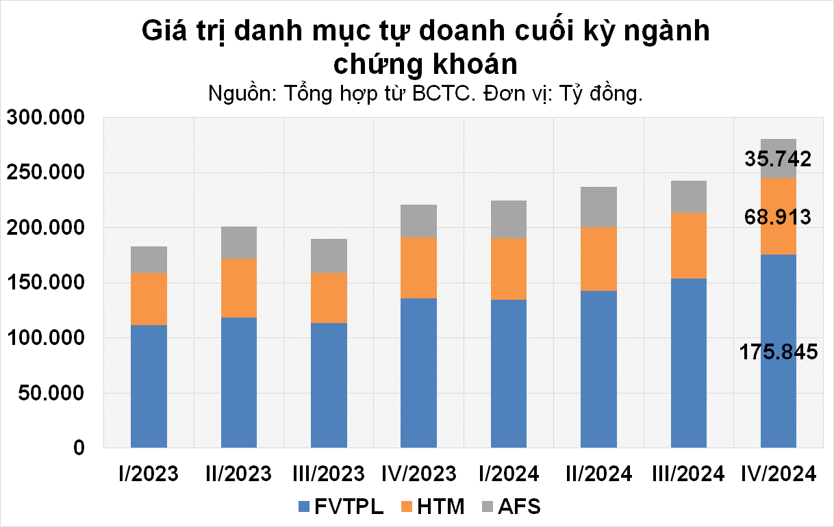 Thống kê báo cáo tài chính gần 80 công ty chứng khoán (CTCK) cho thấy tổng giá trị tự doanh đạt 280.500 tỷ đồng (xấp xỉ 11,2 tỷ USD, tạm tính 1 USD đổi 25.000 VND) tại cuối năm 2024, tăng hơn 38.100 tỷ đồng, tương đương 16% sau ba tháng.