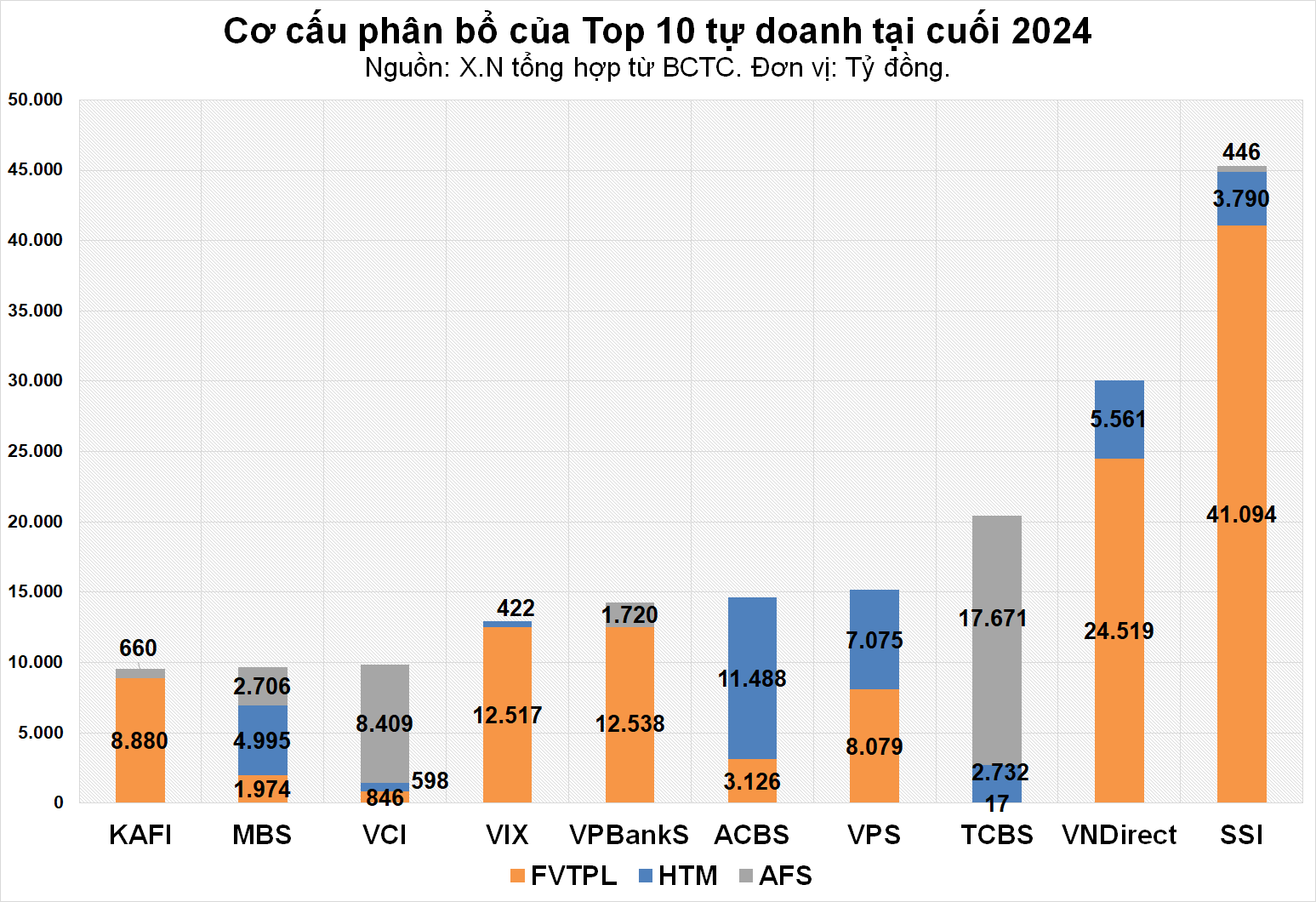 Giống Vietcap, Chứng khoán Kỹ Thương (TCBS) cũng phân bổ tự doanh chủ yếu ở AFS, với tỷ trọng 87%, tương ứng với 17.671 tỷ đồng, còn lại hơn 13% là HTM, khoản FVTPL chiếm không đáng kể.