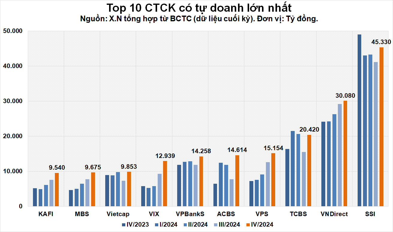 Top 10 đơn vị có khoản tự doanh lớn nhất chiếm gần 182.000 tỷ đồng, tương đương 65% giá trị tự doanh toàn ngành. Sau khi vừa lọt Top 10 trong quý III/2024, Chứng khoán Thành phố Hồ Chí Minh (HSC - Mã: HCM) và Chứng khoán MB (Mã: MBS) đã bị loại tại quý cuối năm. Trong khi đó, Chứng khoán Vietcap (Mã: VCI) trở lại bảng xếp hạng, cùng với gương mặt mới là Chứng khoán Kafi.