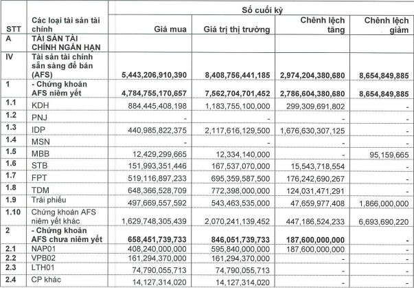 AFS của Vietcap đang có giá trị 8.409 tỷ đồng, tăng 29% sau một quý, chiếm 85% mảng tự doanh. Danh mục vẫn nắm giữ các mã như KDH, PNJ, IDP, MSN, MBB, STB, FPT, TDM, trái phiếu và một số chứng khoán chưa niêm yết khác.
