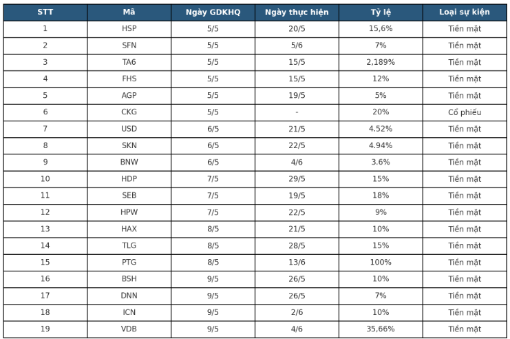 Theo thống kê, trong tuần từ 5/5 đến 9/5, thị trường chứng khoán có tổng cộng 18 doanh nghiệp chốt ngày giao dịch không hưởng quyền để nhận cổ tức tiền mặt, cổ phiếu.