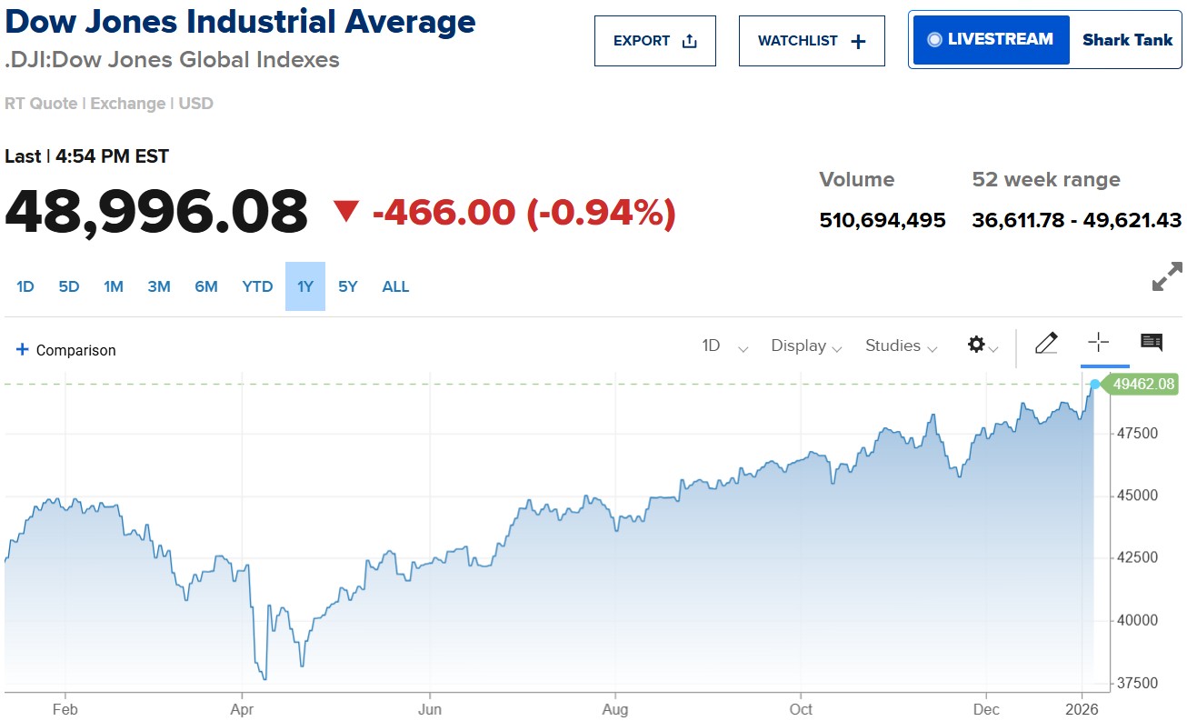 Khép phiên, chỉ số Dow Jones giảm 466 điểm (-0,94%), về 48.996,08 điểm. S&P 500 cũng sụt 0,34%, đóng cửa tại 6.920,93 điểm, còn Nasdaq Composite đi ngược xu hướng khi tăng nhẹ 0,16% lên 23.584,27 điểm.