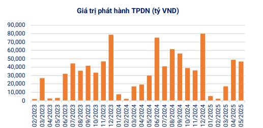 Theo dữ liệu từ Hiệp hội Thị trường Trái phiếu Việt Nam (VBMA), tính đến ngày 31/5/2025, thị trường trái phiếu doanh nghiệp Việt Nam ghi nhận 42 đợt phát hành trái phiếu riêng lẻ với tổng giá trị đạt 46.771 tỷ đồng trong tháng 5.