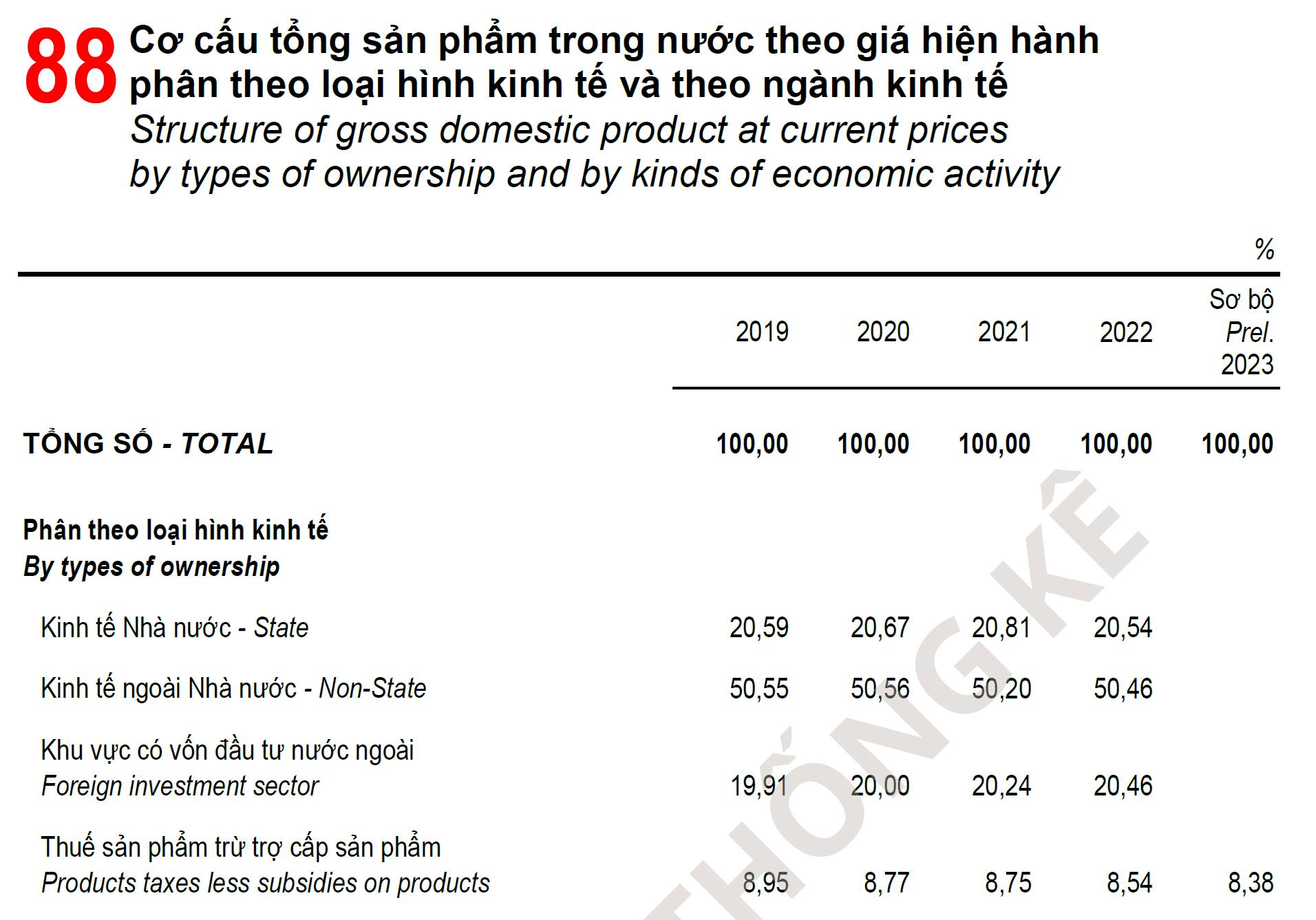 Bảng 88 của NGTK 2023 (xem file ảnh đính kèm) cho biết cơ cấu GDP theo loại hình kinh tế, bao gồm (1) Kinh tế nhà nước, (2) Kinh tế ngoài nhà nước; và (3) Khu vực có vốn đầu tư nước ngoài (FDI) trong bốn năm từ 2019 đến 2022.