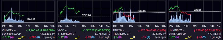 Mặc dù VN-Index giữ sắc xanh, tuy nhiên số lượng mà giảm lại chiếm ưu thế. Kết thúc phiên sáng, trên sàn HoSE có 152 mã tăng và 207 mã giảm, 89 mã tham chiếu.