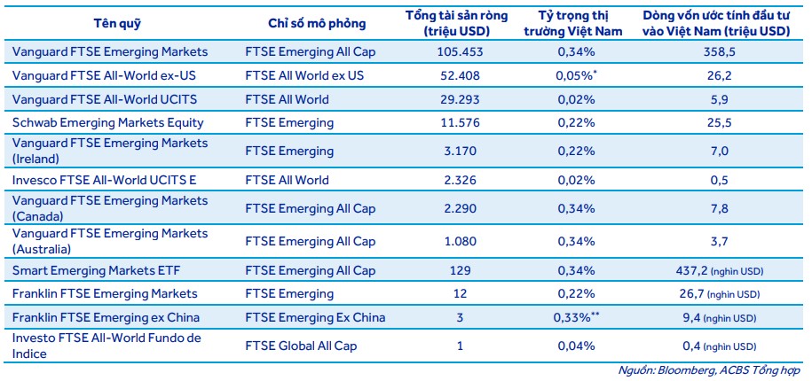 Theo ước tính của CTCP Chứng khoán ACB (ACBS), tổng dòng vốn có thể đổ vào Việt Nam từ các quỹ ETF mô phỏng các chỉ số liên quan sẽ đạt khoảng 435,4 triệu USD.