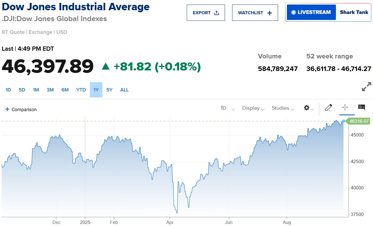 Tính chung tháng 9, S&P 500 tăng hơn 3%, Dow Jones tiến gần 2% và Nasdaq Composite vọt 5,6%. Quý 3/2025 cũng ghi nhận sự bứt phá mạnh: S&P 500 tăng gần 8%, Nasdaq leo hơn 11% và Dow Jones cộng hơn 5%, đánh dấu quý tăng trưởng thứ 5 liên tiếp.
