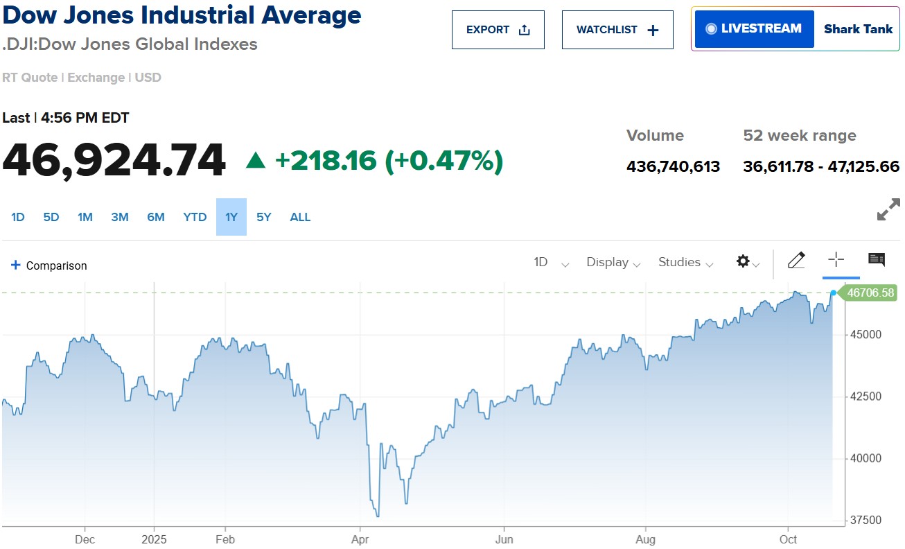 Chốt phiên, Dow Jones tăng 218,16 điểm (+0,47%) lên 46.924,74 điểm và từng có thời điểm vượt mốc 47.000 điểm. Chỉ số S&P 500 giữ ở mức 6.735,35 điểm, gần như không đổi. Nasdaq Composite giảm nhẹ 0,16% xuống 22.953,67 điểm.