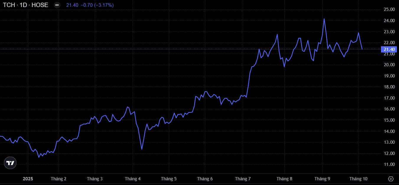 Phiên 1/10, cổ phiếu TCH bùng nổ thanh khoản với khối lượng khớp lệnh đạt gần 20 triệu đơn vị, đóng cửa ở mức 22.900 đồng/cp. Sau hai phiên giảm điểm liên tiếp, thị giá TCH giảm xuống còn 21.400 đồng/cp.