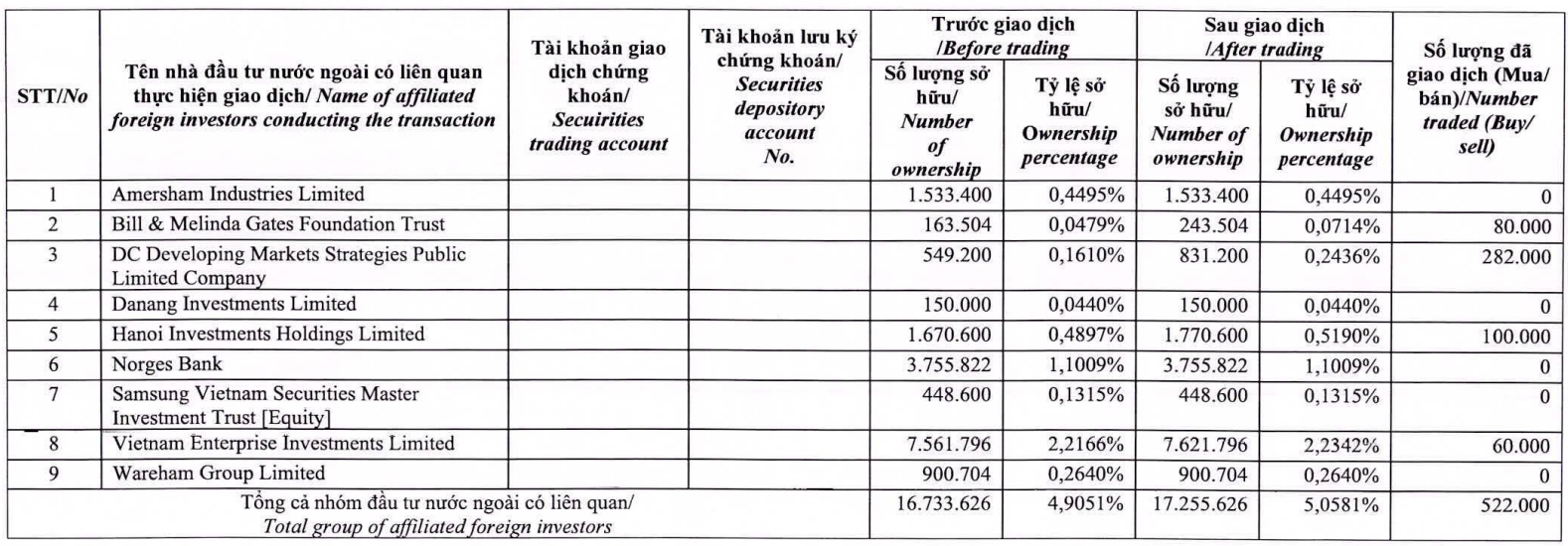 Cụ thể, trong phiên giao dịch ngày 10/02/2026, Dragon Capital – đã thông qua 4 quỹ thành viên là Bill & Melinda Gates Foundation Trust, DC Developing Markets Strategies Public Limited Company, Hanoi Investments Holdings Limited, và Vietnam Enterprise Investments Limited – để gom thêm 522.000 cổ phiếu PNJ.