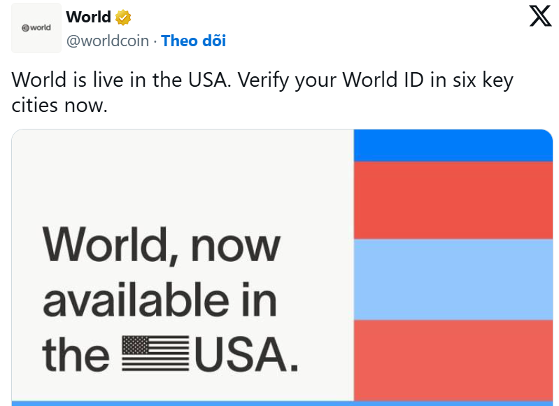 Theo đó, công dân Mỹ sẽ nhận token $WLD sau khi hoàn thành xác minh danh tính và thiết lập World ID cá nhân. Dự án được triển khai tại 6 thành phố: Atlanta, Austin, Los Angeles, Miami, Nashville và San Francisco.