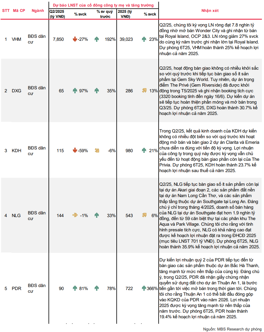 Tuy nhiên, MBS cho rằng điều này không đồng nghĩa với khả năng hoàn thành kế hoạch lợi nhuận cả năm là thấp. Ngược lại, nhóm BĐS vẫn có thể đạt được "target" kinh doanh trong năm 2025, nhờ các dự án gối đầu dự kiến sẽ được bàn giao trong nửa cuối năm, như: Park Village và The Aqua thuộc đại dự án Southgate (NLG), The Foresta (KDH), Thuận An 1 & 2 (PDR).