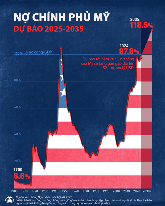 Đồ thị thông tin dưới đây thể hiện dự báo tỷ lệ nợ trên GDP của Chính phủ Mỹ từ năm 1900 đến nay và dự báo năm 2025-2035, dựa trên dữ liệu từ Văn phòng Ngân sách Quốc hội Mỹ (CBO).