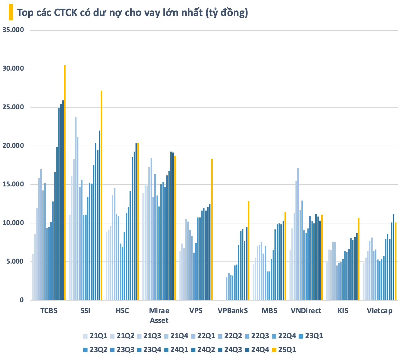 Theo thống kê, tính đến cuối quý 1/2025, dư nợ cho vay tại các công ty chứng khoán ước tính vào khoảng 280.000 tỷ đồng (~11 tỷ USD), tăng 35.000 tỷ so với cuối năm 2024 trước đó và là mức cao kỷ lục từ trước đến nay. Trong đó, dư nợ margin ước tính khoảng 273.000 tỷ đồng, tăng 33.000 tỷ so với cuối năm 2024 và cũng là con số cao nhất trong lịch sử chứng khoán Việt Nam.