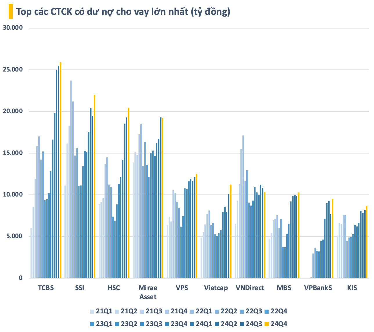 Tính đến cuối năm 2024, toàn thị trường ghi nhận 8 công ty chứng khoán có dư nợ trên 10.000 tỷ đồng, trong đó 3 cái tên dẫn đầu đều có dư nợ trên 20.000 tỷ. TCBS tiếp tục giữ vị trí số 1 về dư nợ cho vay với gần 26.000 tỷ đồng. Đây cũng là CTCK duy nhất có dư nợ trên 1 tỷ USD. Với làn sóng tăng vốn đã, đang và sẽ diễn ra trong ngành chứng khoán, các công ty sẽ có thêm nguồn để cho vay. Không loại trừ khả năng Việt Nam sẽ sớm có thêm công ty chứng khoán dư nợ tỷ USD.