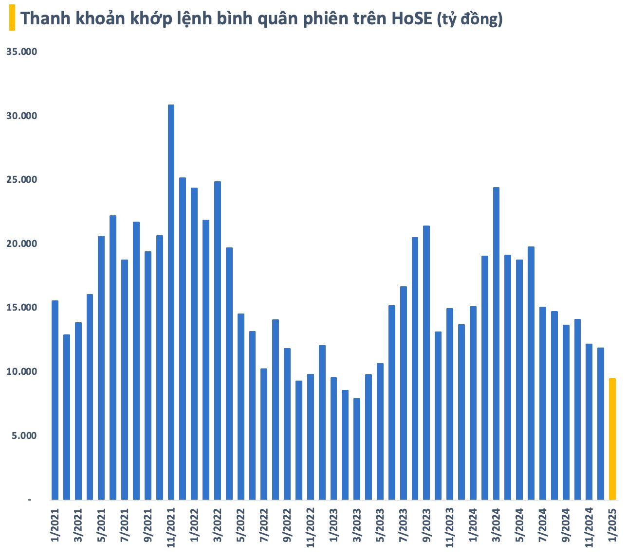 Đáng chú ý, dư nợ margin tiếp tục tăng cao lên mức kỷ lục mới trong bối cảnh giao dịch trên thị trường ngày càng ảm đạm. Giá trị khớp lệnh trên HoSE liên tục có xu hướng giảm qua từng tháng xuống dưới 12.000 tỷ đồng vào tháng 12 năm ngoái. Con số này tiếp tục giảm mạnh trong tháng đầu năm 2025 khi tâm lý nghỉ Tết bao trùm.