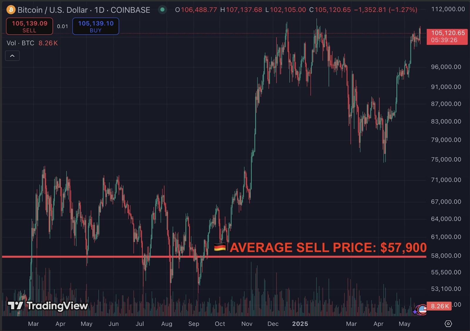 Đức - nền kinh tế số 1 châu Âu - đã bở lỡ khoản lợi nhuận 2,3 tỷ USD sau khi xả sạch gần 50.000 Bitcoin vào mùa hè 2024 ở mức giá trung bình 57.900 USD/BTC, để rồi ngồi nhìn giá tăng vọt lên 104.700 USD mà không kịp trở tay.