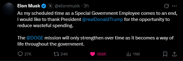 Trên nền tảng X, vị tỷ phú gửi lời cảm ơn đến ông Trump và cho biết nhiệm vụ "cắt giảm lãng phí ngân sách" của ông tại DOGE sẽ tiếp tục là di sản.