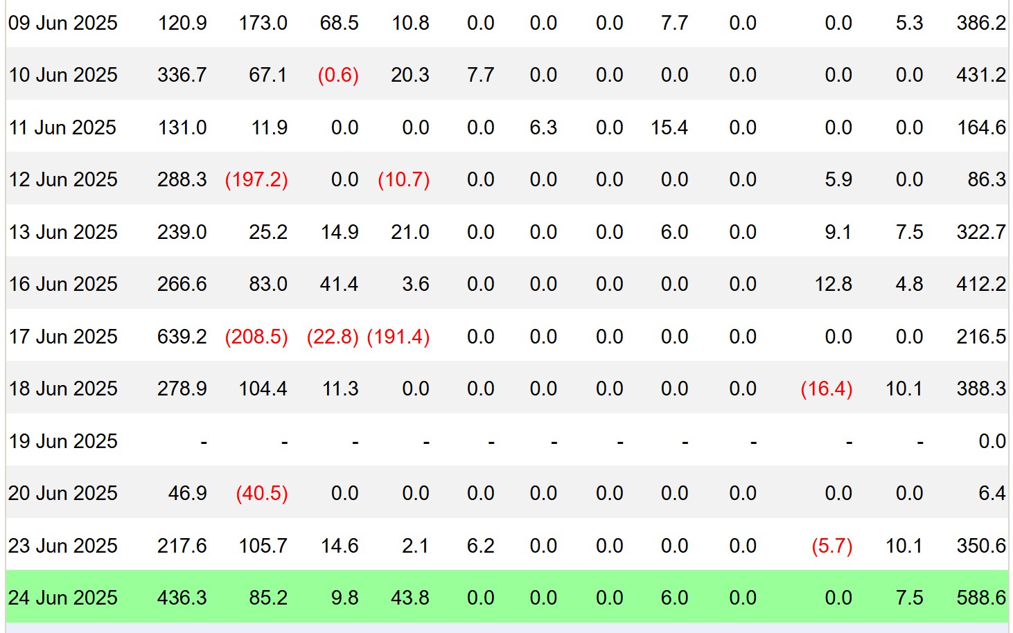Các quỹ ETF Bitcoin giao ngay tại Mỹ vừa ghi nhận dòng tiền mạnh nhất trong tháng 6, với tổng cộng 588,6 triệu USD đổ vào chỉ trong ngày 24/6, nâng chuỗi hút vốn lên 11 phiên – dài nhất kể từ tháng 12/2024.