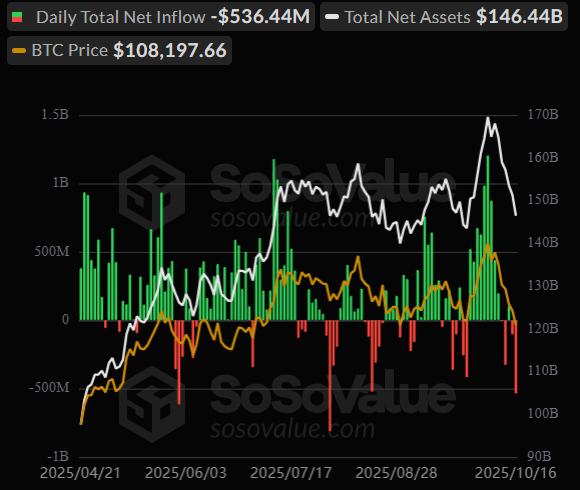Thị trường quỹ hoán đổi danh mục (ETF) Bitcoin giao ngay tại Mỹ vừa chứng kiến làn sóng rút vốn mạnh nhất kể từ ngày 1/8, với tổng giá trị lên tới 536,4 triệu USD chỉ trong ngày 16/10.