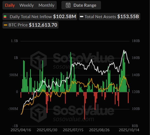 Theo dữ liệu từ SoSoValue, các quỹ ETF Bitcoin giao ngay ghi nhận tổng dòng vốn vào 102,6 triệu USD ngày 14/10.