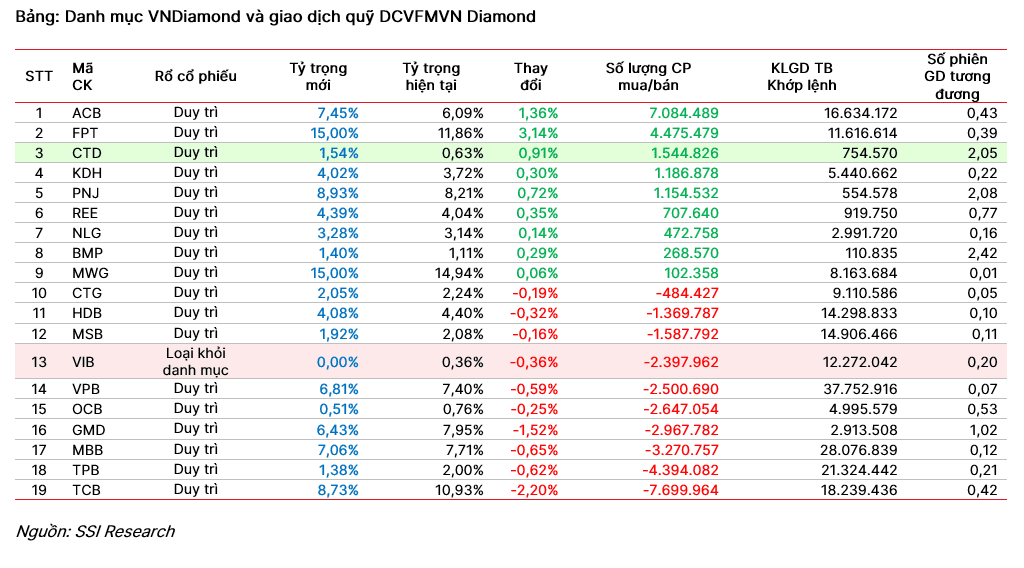 Dữ liệu từ SSI Research cho thấy, riêng quỹ DCVFMVN Diamond – quỹ ETF mô phỏng chỉ số VNDiamond lớn nhất thị trường với tổng tài sản khoảng 13.200 tỷ đồng – sẽ thực hiện mua vào hơn 7 triệu cổ phiếu ACB, hơn 4,4 triệu cổ phiếu FPT và khoảng 1,5 triệu cổ phiếu CTD.