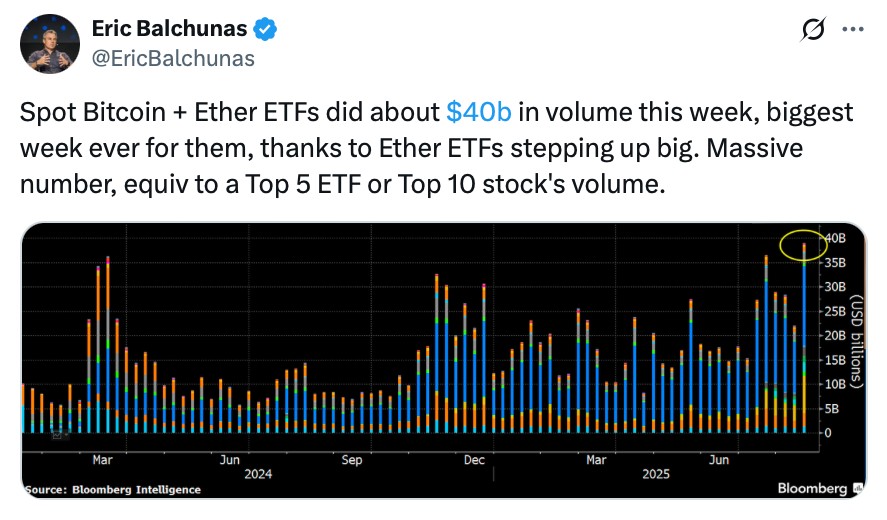 ETF crypto đạt khối lượng giao dịch 40 tỷ USD trong tuần qua (Nguồn: Eric Balchunas)