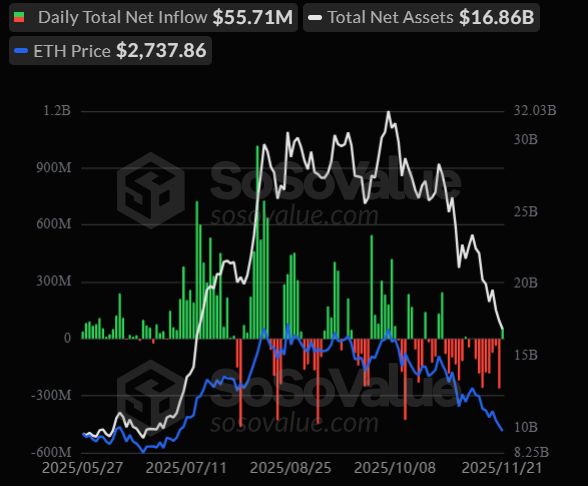 Trước đó, giai đoạn từ 11–20/11, các quỹ Ethereum đã bị rút tổng cộng 1,28 tỷ USD, chuỗi rút voosn lớn và kéo dài nhất kể từ khi ra mắt.