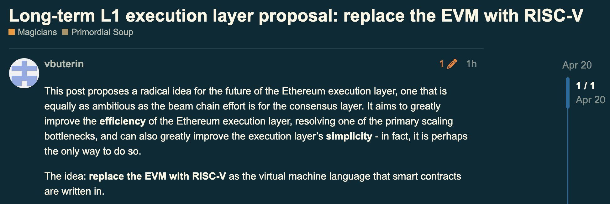 Vitalik Buterin - "cha đẻ" Ethereum - vừa tung ra một đề xuất mới: Thay đổi nền tảng cốt lõi xử lý hợp đồng thông minh EVM hiện tại - bằng một kiến trúc tập lệnh phổ biến trong thế giới phần cứng mang tên RISC-V.