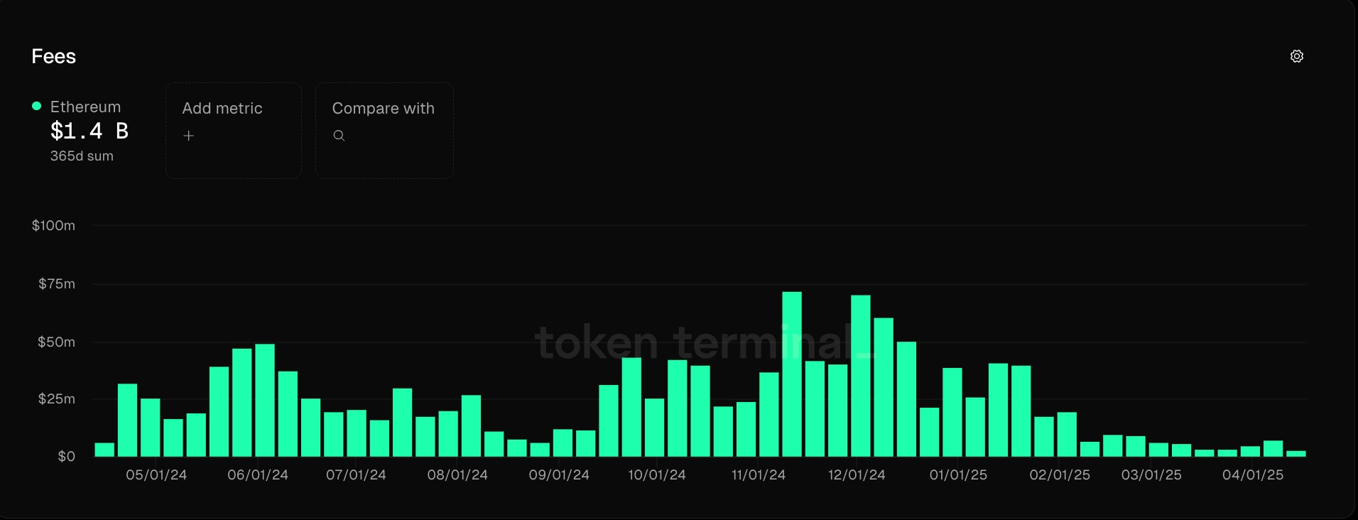 Phí giao dịch hàng tuần của mạng lưới Ethereum đã giảm đáng kể trong Q1/2025. (Nguồn: Token Terminal)