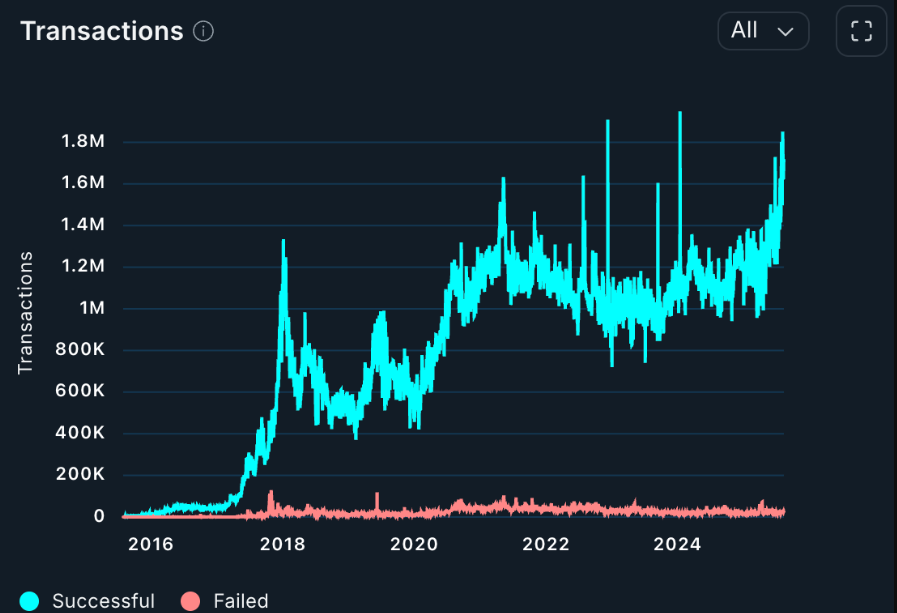 Theo dữ liệu từ Nansen, số lượng giao dịch trung bình hàng ngày trên Ethereum đang ở gần mức cao kỷ lục, hơn 1,7 triệu giao dịch.