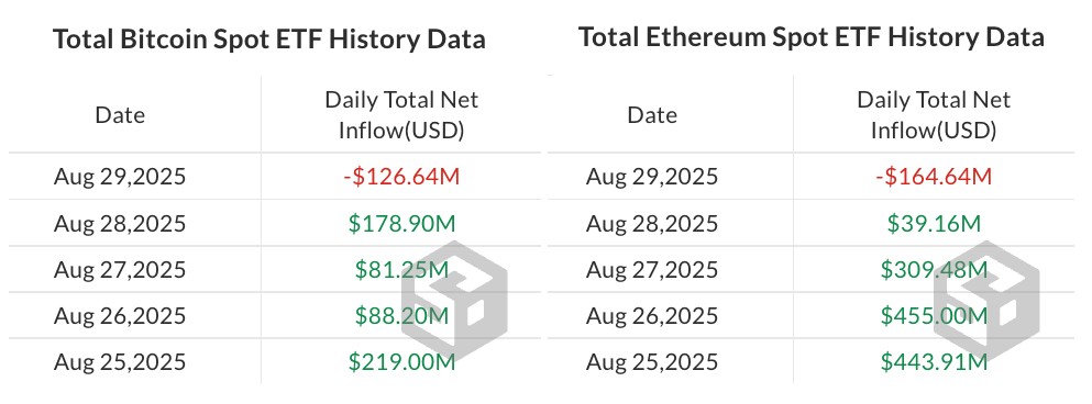 Dữ liệu từ SoSoValue cho thấy cả 2 nhóm quỹ đều ghi nhận rút vốn trong ngày 29/8, chấm dứt chuỗi 6 ngày hút vốn liên tục của Ether và 4 ngày liên tiếp của Bitcoin.