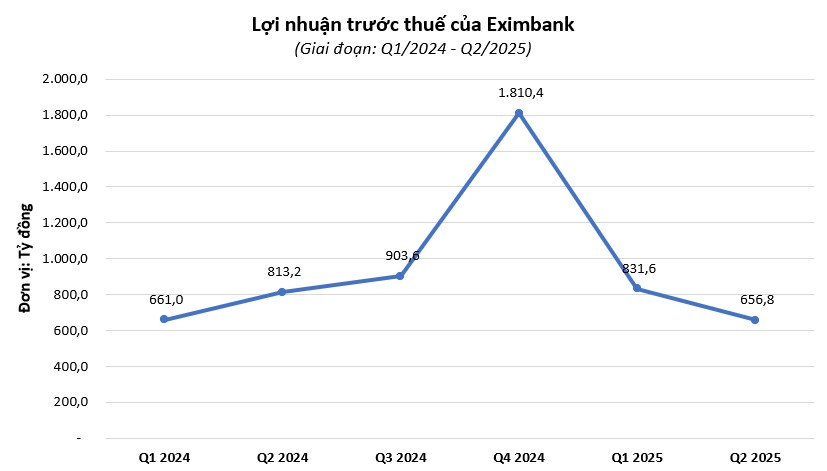 Lũy kế 6 tháng đầu năm 2025, Eximbank ghi nhận lợi nhuận trước thuế đạt 1.488,5 tỷ đồng, tăng nhẹ so với cùng kỳ năm trước, hoàn thành 28,6% kế hoạch.