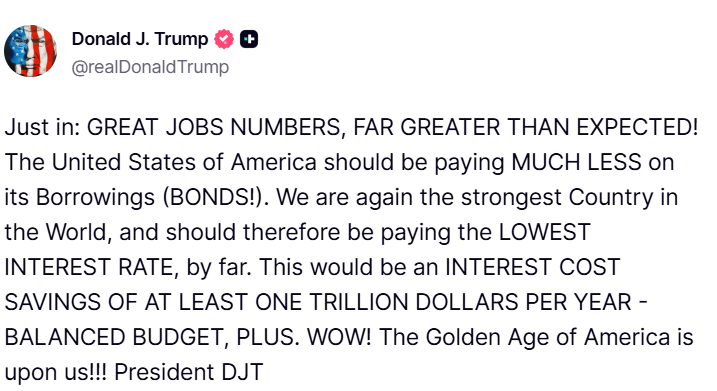 Cùng lúc, Tổng thống Donald Trump tiếp tục kêu gọi cắt giảm thêm lãi suất. Trong một bài đăng trên mạng xã hội sau khi số liệu việc làm được công bố, ông ca ngợi “CÁC CON SỐ VỀ VIỆC LÀM THẬT TUYỆT VỜI”. Đồng thời, ông cho rằng Mỹ nên duy trì mức lãi suất thấp nhất thế giới.