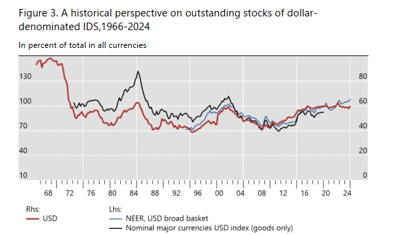 Dữ liệu về thị trường trái phiếu nợ quốc tế (International Debt Securities – IDS) từ thập niên 1960 đến nay cho thấy, tỷ trọng các khoản nợ quốc tế được phát hành bằng đồng USD so với các đồng tiền khác không tuyến tính.