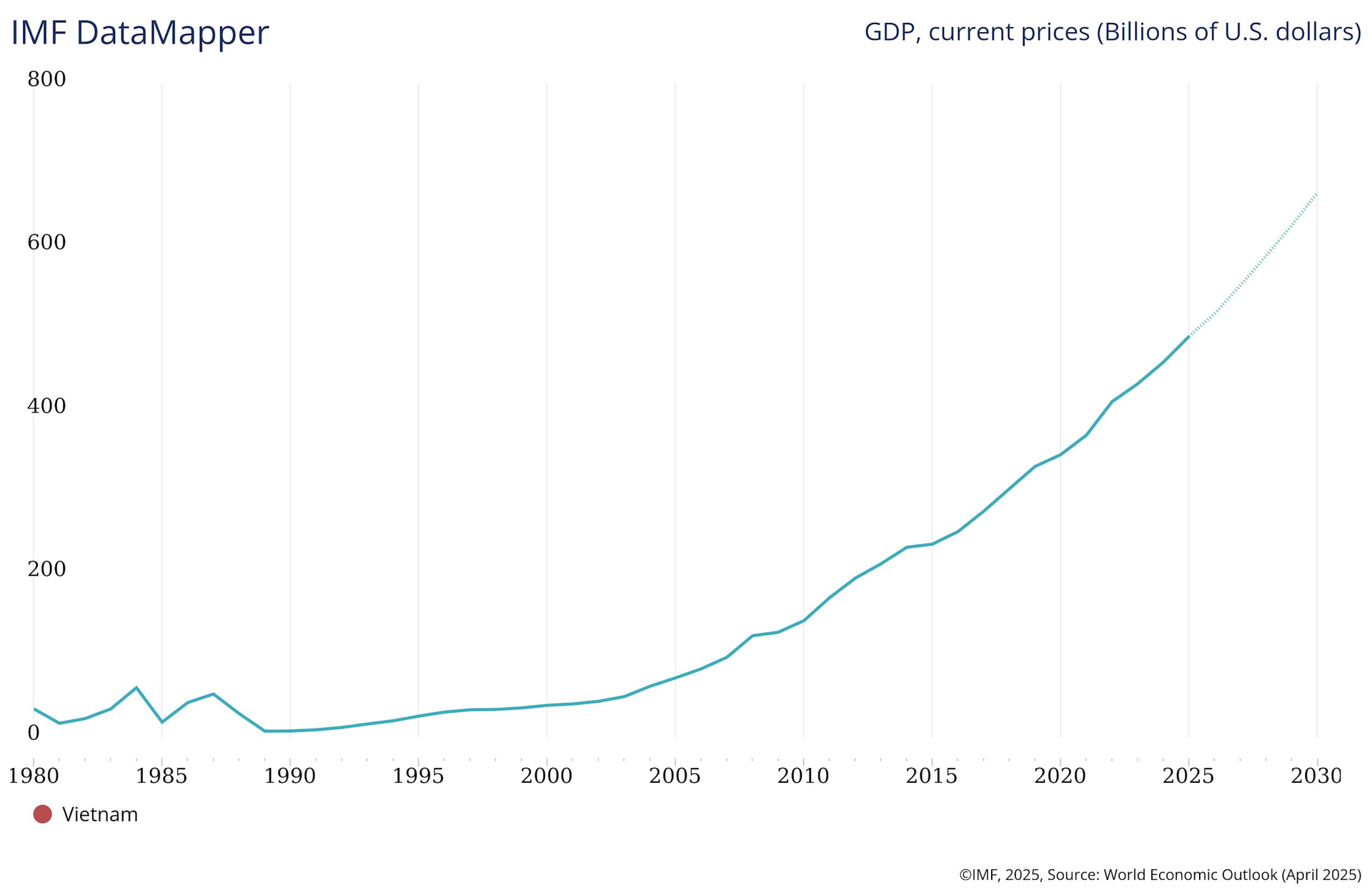 IMF dự báo, quy mô kinh tế của Việt Nam năm 2025 ước đạt 491 tỷ USD, xếp thứ 34 trên thế giới và xếp thứ 5 trong khu vực Đông Nam Á, sau Indonesia (1,3 nghìn tỷ USD), Singapore (564,7 tỷ USD), Thái Lan (546,2 tỷ USD) và Philippines (497,5 tỷ USD).