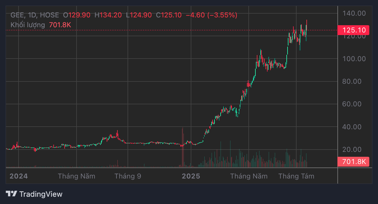 Diễn biến giá cổ phiếu GEE: Chốt phiên ngày 21/8, GEE đóng cửa ở mức 125.100đ/cổ phiếu, tăng gần 5 lần so với giá đầu năm. (Ảnh: Trading View)