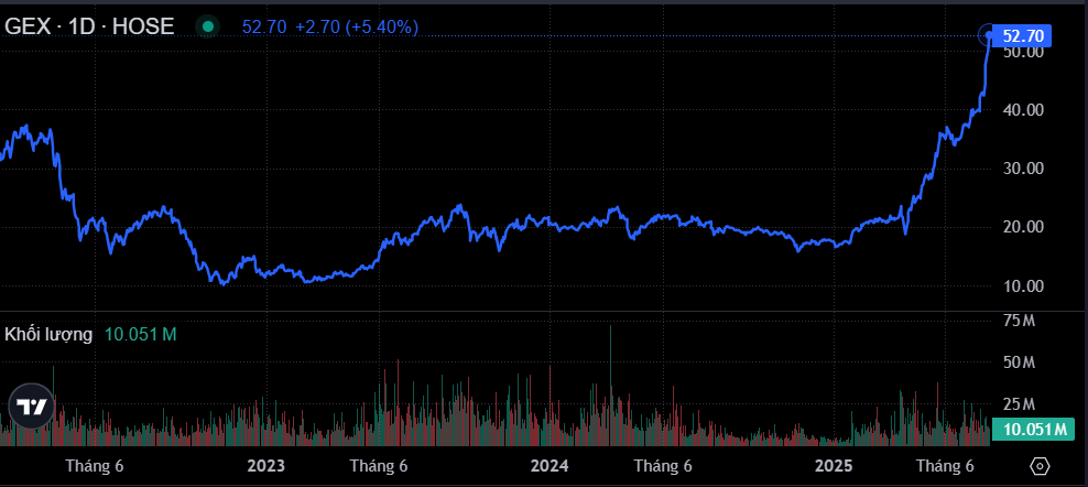 Trên thị trường chứng khoán, tính đến 11h15 sáng 25/7, cổ phiếu GEX tiếp tục thể hiện hiệu suất ấn tượng khi tăng 5,4% lên 52.700 đồng/cp. Nếu xét từ vùng đáy hồi đầu tháng 4, mã này đã tăng gần gấp ba lần và đang liên tiếp thiết lập các vùng đỉnh lịch sử mới./.