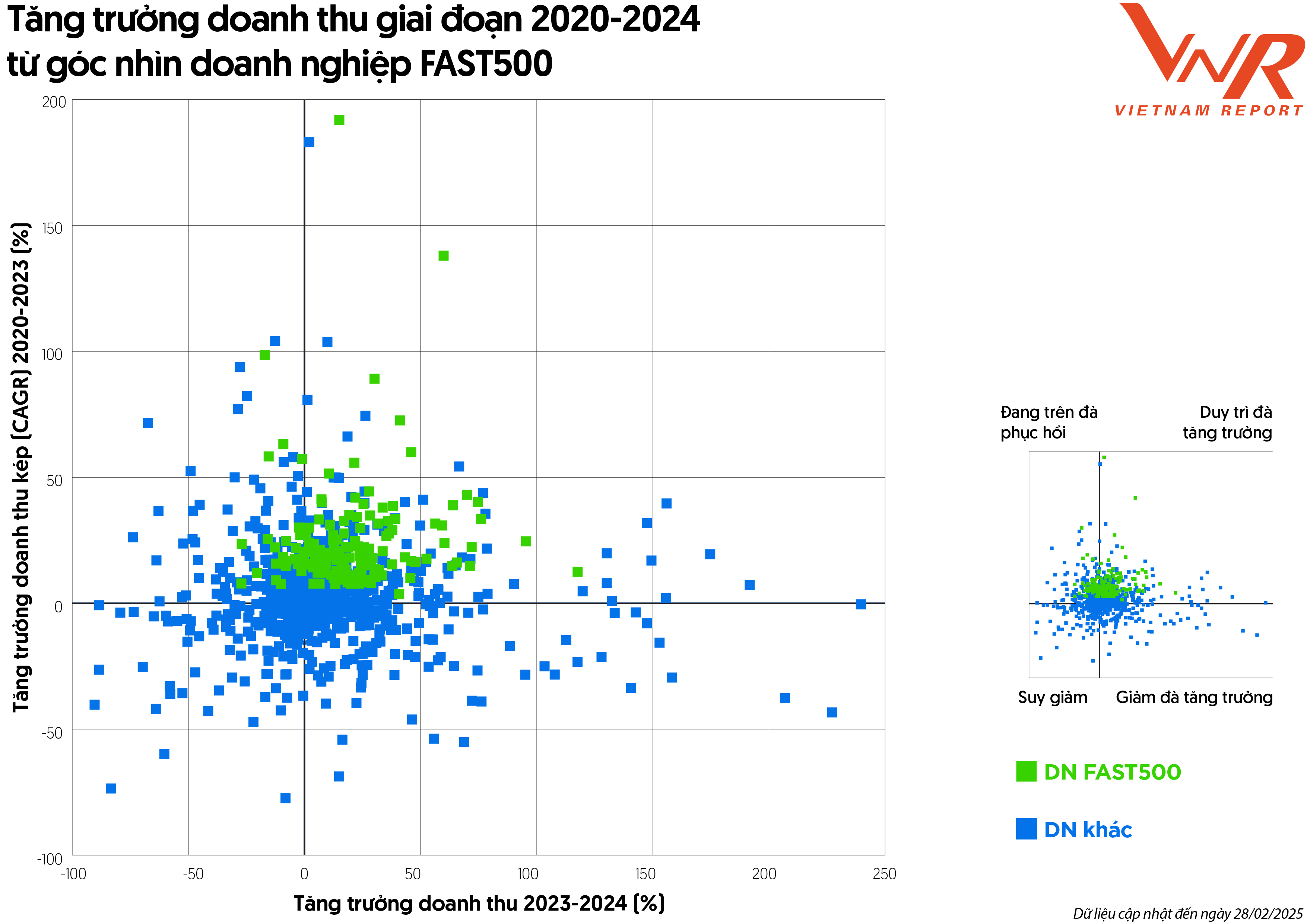 Căn cứ vào số liệu tài chính năm 2024, Vietnam Report cho rằng, các doanh nghiệp FAST500 không chỉ duy trì tốc độ tăng trưởng doanh thu ổn định trong giai đoạn 2020-2023 mà tiếp tục có mức tăng trưởng tích cực trong năm 2024, trong khi nhóm còn lại có sự phân tán rộng, với nhiều điểm dữ liệu rơi vào vùng suy giảm hoặc giảm đà tăng trưởng.