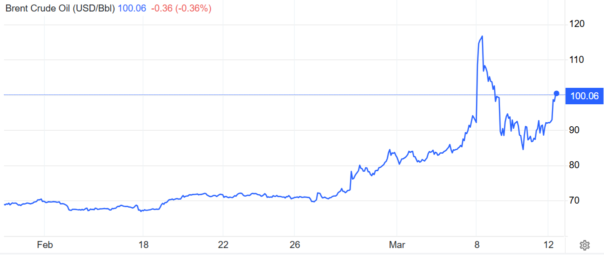 Trong phiên sáng 12/3 (giờ Việt Nam), giá dầu Brent tăng khoảng 9,18% lên 101,16 USD/thùng. Trong khi đó, giá dầu WTI của Mỹ cũng tăng 7,93% lên 95,18 USD/thùng. Trên thị trường tương lai, dầu Brent tăng khoảng 9,3%, vượt ngưỡng 100 USD/thùng, còn WTI tăng gần 9% lên quanh 95 USD/thùng.