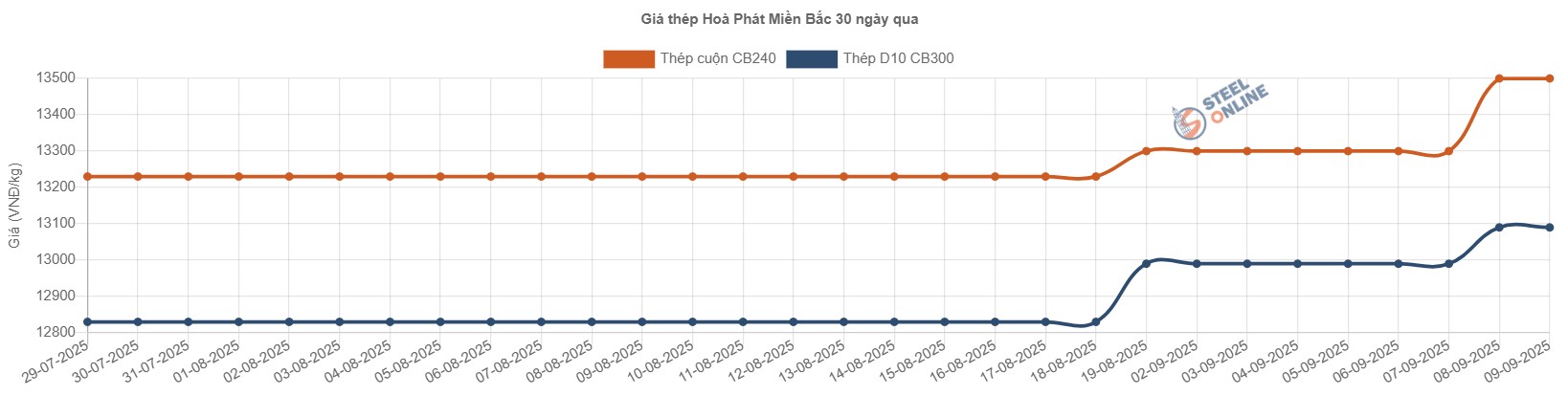 Dữ liệu từ Steelonline cho thấy, nhiều thương hiệu thép đồng loạt tăng giá trong ngày 9/9. Tại khu vực miền Bắc, giá thép cuộn và thép thanh vằn của Hòa Phát đều tăng. Cụ thể, thép thanh vằn D10 CB300 hiện có giá 13,09 triệu đồng/tấn, tăng 100.000 đồng/tấn so với ngày trước đó; trước đó, ngày 18/8, giá sản phẩm này cũng được điều chỉnh tăng 100.000 đồng/tấn.