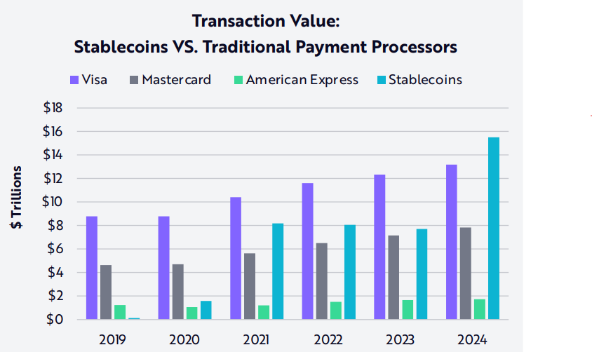 Bất chấp những biến động mạnh mẽ trên thị trường tiền số, stablecoin vẫn duy trì sức hút và tốc độ tăng trưởng ấn tượng. Theo báo cáo Big Ideas 2025 của ARK Invest, tổng giá trị giao dịch stablecoin đã đạt 15.600 tỷ USD vào năm 2024 – cao hơn 19% so với Visa và gấp 3 lần Mastercard.