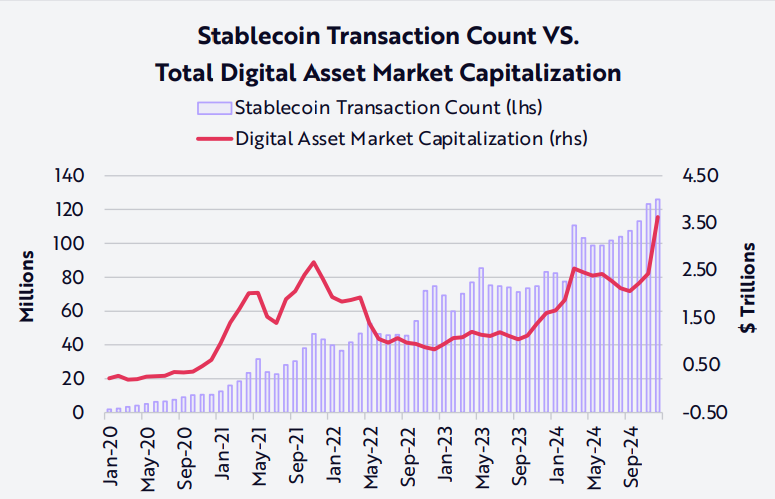 Từ đầu năm 2020 đến cuối năm 2024, khối lượng giao dịch stablecoin không ngừng gia tăng. Đặc biệt, kể từ cuối tháng 9/2024, số lượng giao dịch tăng vọt, vượt mốc 120 triệu giao dịch – một tín hiệu cho thấy stablecoin đang ngày càng được chấp nhận rộng rãi.