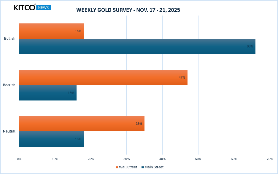Theo khảo sát của Kitco với 17 chuyên gia phố Wall, có 8 người dự báo giá vàng sẽ giảm trong ngắn hạn, 6 người giữ quan điểm trung lập và chỉ 3 chuyên gia lạc quan. Trong khi đó, khảo sát với 230 nhà đầu tư cá nhân cho thấy tâm lý tích cực vẫn chiếm ưu thế: gần 66% kỳ vọng giá vàng sẽ tăng, 16,5% dự báo giảm và 17,8% giữ quan điểm trung lập.