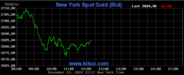 Theo dữ liệu từ Kitco.com, tính đến 0h15 ngày 12/12 (theo giờ Việt Nam), giá vàng thế giới giao ngay niêm yết ở mức 2.684,1 USD/ounce, giảm 33,4 USD so với đóng cửa phiên giao dịch trước.