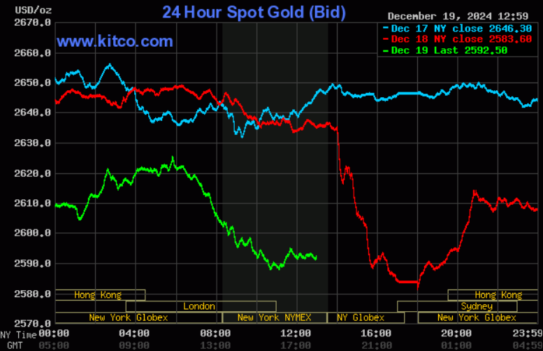 Theo dữ liệu từ Kitco.com, tính đến 1h ngày 20/12 (theo giờ Việt Nam), giá vàng thế giới giao ngay niêm yết ở mức 2.592,5 USD/ounce, tăng 8,9heo dữ liệu từ Kitco.com, tính đến 1h ngày 20/12 (theo giờ Việt Nam), giá vàng thế giới giao ngay niêm yết ở mức 2.590,5 USD/ounce, tăng 8,9 USD so với đóng cửa phiên giao dịch trước.