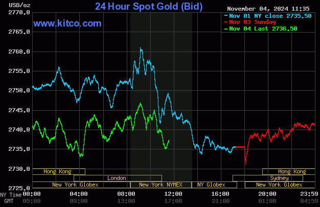 Theo dữ liệu từ Kitco.com, tính đến 23h10 ngày 4/11 (theo giờ Việt Nam), giá vàng thế giới giao ngay niêm yết ở mức 2.736,5 USD/ounce, tăng nhẹ 1 USD so với đóng cửa phiên giao dịch trước.