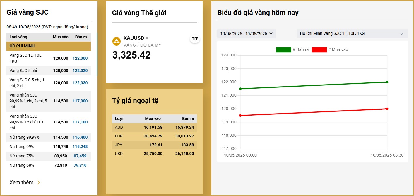 Giá vàng miếng trong nước sáng 10/5 tiếp tục tăng mạnh, lên 122 triệu đồng/lượng.