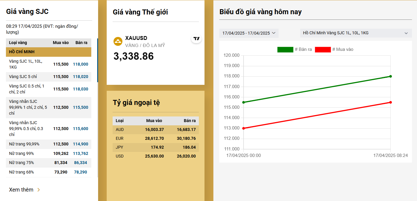 Cập nhật tới 8h35 sáng ngày 17/4, SJC niêm yết giá vàng miếng ở mức 115,5 – 118 triệu đồng/lượng, tăng 2,5 triệu đồng/lượng ở cả 2 chiều mua - bán so với giá mở cửa sáng cùng ngày.